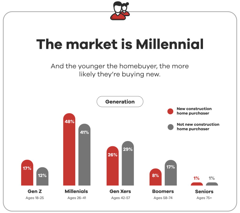 Our Realtor.com® 2024 New Construction Consumer Report found that 48% of 2023’s new construction homebuyers were Millennials (ages 26-41). In short, Millennials are now major money makers for the new construction market.